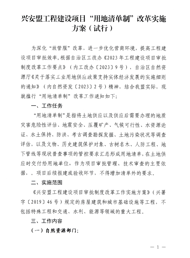 兴安盟工程建设项目“用地清单制”改革实施方案(试行)