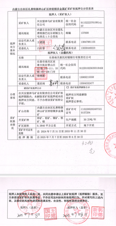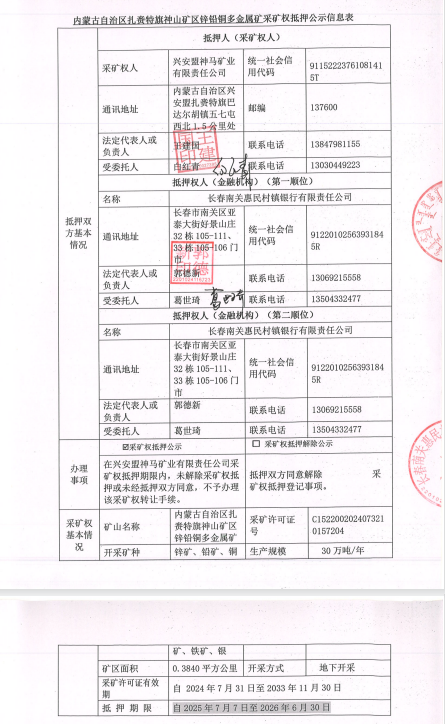 2.内蒙古自治区扎赉特旗神山矿区锌铅铜多金属矿采矿权抵押公示信息表