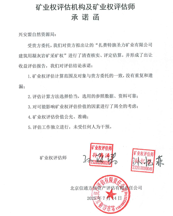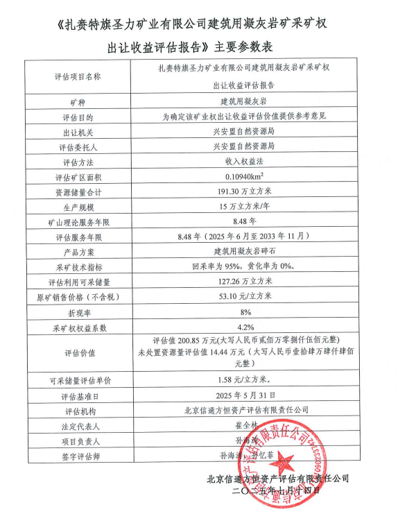 兴安盟自然资源局收到北京信通方恒资产评估有限责任公司提交的《扎赉特旗圣力矿业有限公司建筑用凝灰岩矿采矿权出让收益评估报告》(信通方恒采评字【2025】第020805号),现予以公示。公示日期从2025年08月27日至2025年09月02日(5个工作日)。如有异议,请书面反馈我局。单位地址:内蒙古自治区兴安盟乌兰浩特市盟公署东侧内蒙古地矿大楼403。