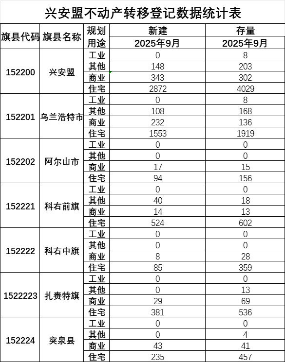 兴安盟不动产转移登记数据统计表(2025年9月)